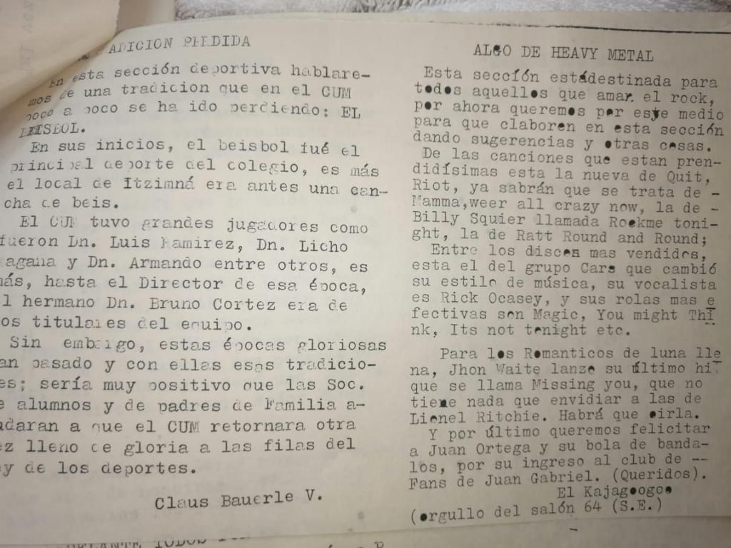 La edición incluye una reseña del béisbol como deporte principal en el plantel firmado por Claus Bahuerle y una columna de los hits musicales del momento como la canción “Mamma we are all crazy now” de la banda de Heavy Metal “Quiet Riot” y una felicitación a “Juan Ortega y su bola de bándalos (sic) por unirse al Club de Fans de Juan Gabriel. La reseña está firmada por “Kajagogo”
